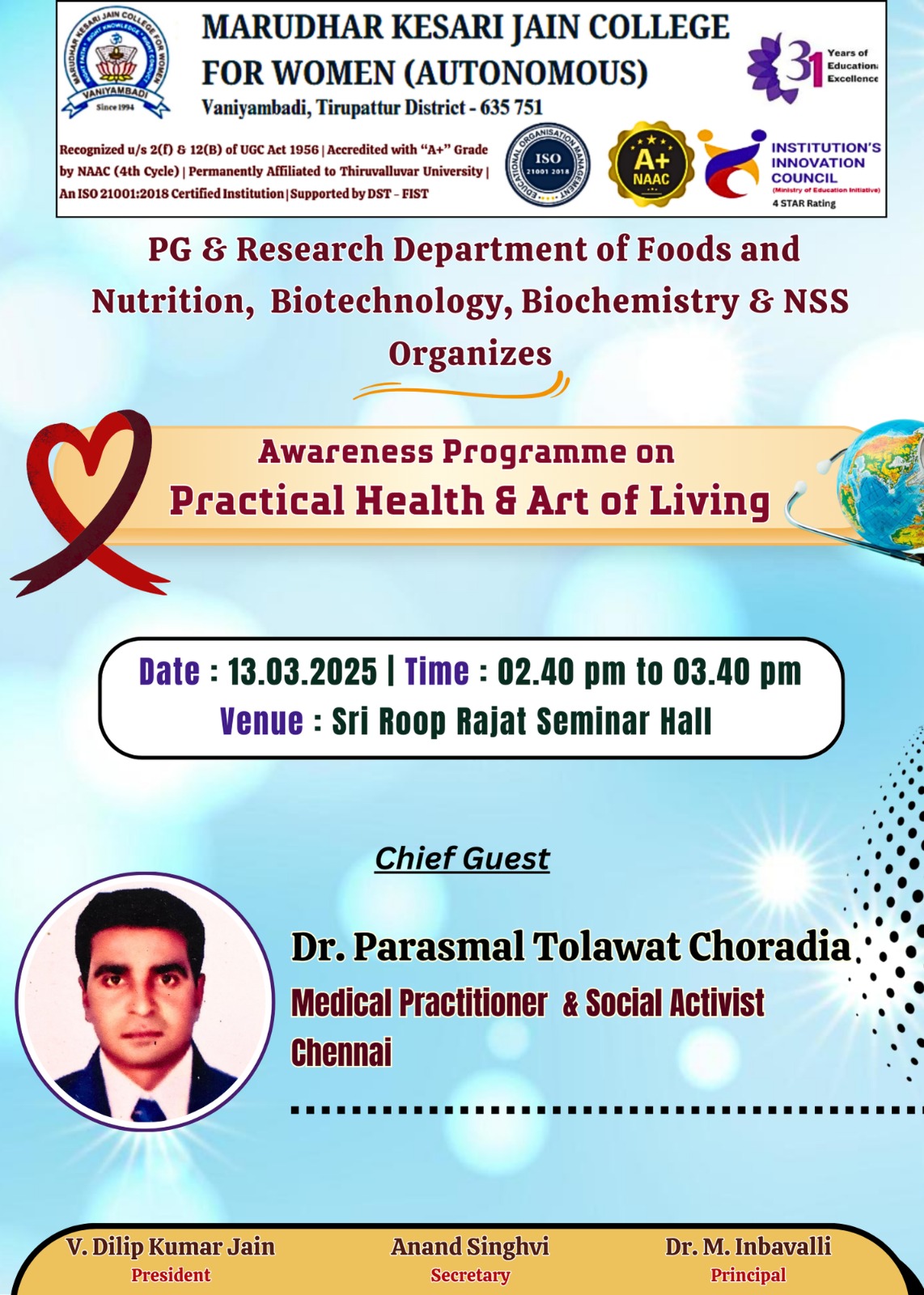 Department of Foods and Nutrition, Biotechnology, Biochemistry & NSS - "Awareness Programme on Practical Health & Art of Living" -13-03-2025