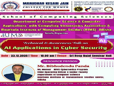 Department of Computer Science & Computer Applications with Computing Visionaries Association & Rourkela Institute of Management Studies (RIMS), Odisha. DIMS School of Management - MoU Activity on Technical & Awareness Talk on Al Applications in Cyber Security – 23.12.2025